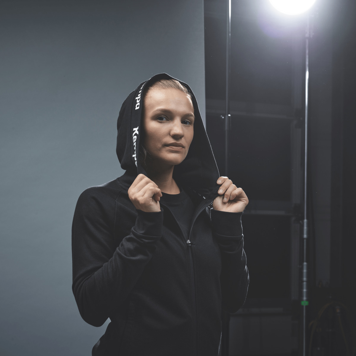 - Kapuze mit Kempa-Wording und Innenfutter in Kontrastfarbe